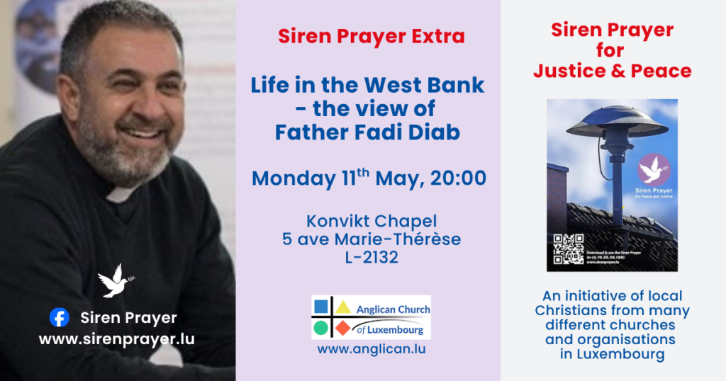 First Monday of every month at 12:00 – when you hear the siren test, please pray for peace and justice wherever you are and wherever it is needed