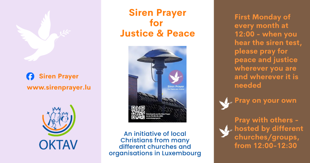 All éischte Méindeg am Mount, um 12.00 Auer – wann Der de Sireenentest héiert, – biet Der, wou och ëmmer Der sidd, fir Fridden a Gerechtegkeet, wou och ëmmer se néideg sinn.